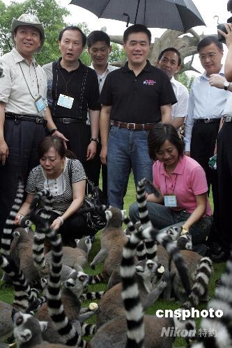 臺(tái)北市長(zhǎng)郝龍斌一行到上海野生動(dòng)物園參觀,并與狐猴“親密接觸”。中新社發(fā) 潘索菲 攝