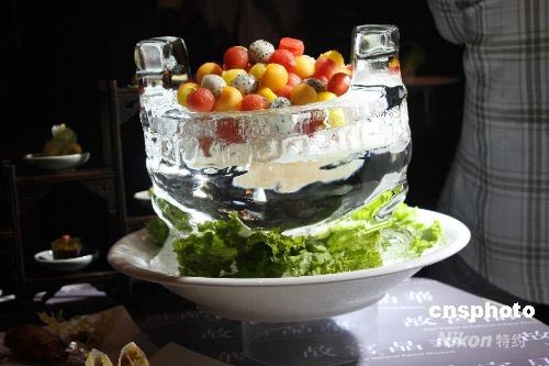 主廚仿照西周晚期的“毛公鼎”造型制作成冰雕,晶亮剔透的“鼎”中 ,盛裝著臺(tái)灣的特產(chǎn)水果,給人視覺(jué)與味覺(jué)的驚喜。中新社發(fā) 耿軍 攝