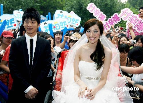 6月25日,北京,吳佩慈簽約星光國際傳媒集團。華誼兄弟、星光國際各自帶來了自己的最強陣容,簽約儀式被布置成婚禮的形式,“男才女貌”組合袁成杰、戚薇是當天的司儀,BOBO組合代表娘家人作為出嫁伴童,“征婚人”則是蘇有朋。嘉賓紛紛帶來自己的禮物,“男才女貌”組合更是送上擁抱、香吻。中新社發(fā) 袁方 攝