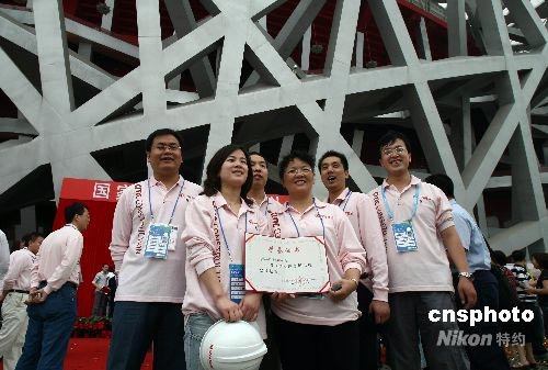 6月28日,北京奧運(yùn)會主體育場——國家體育場(“鳥巢”)落成典禮儀式在北京舉行,建設(shè)者與“鳥巢”合影。中新社發(fā) 盛佳鵬 攝