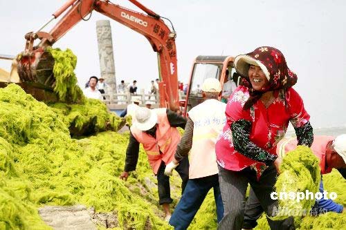 圖為乳山市民眾在近海清理海灘與近海的滸苔。自6月28日以來(lái),在繼奧帆賽舉辦地青島近海出現(xiàn)大量漂浮海藻——滸苔后,距青島僅一個(gè)多小時(shí)車(chē)程的乳山市近海也現(xiàn)了大量滸苔,雖然這些滸苔無(wú)毒無(wú)污染,但仍然引起乳山市的高度關(guān)注,目前乳山近海附近三千余民眾正有序地清理著近海滸苔,截止發(fā)稿時(shí)該市已清理滸苔二萬(wàn)余噸。中新社發(fā) 劉國(guó)賢 攝