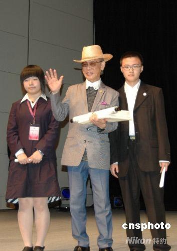 八十九歲高齡的日本漫畫家協(xié)會理事長柳瀨 嵩向來自南山中學的學生代表勾梁丁、蘇思宇同學表達深切的問候,并接受了兩位同學的禮物--南山中學的畫冊。中新社發(fā) 朱沿華 攝