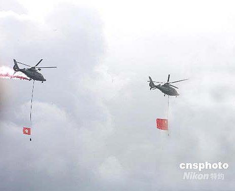 升旗儀式中,直升機(jī)懸掛國旗、區(qū)旗,噴射彩色煙火掠過金紫荊廣場上空。中新社發(fā) 王麗南 攝