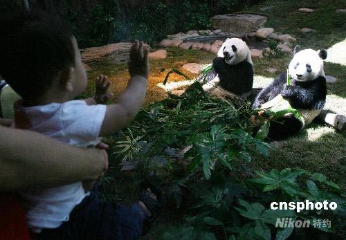 七月一日,游客在香港海洋公園看望在此安家一周年的樂樂、盈盈。中新社發(fā) 武仲林 攝