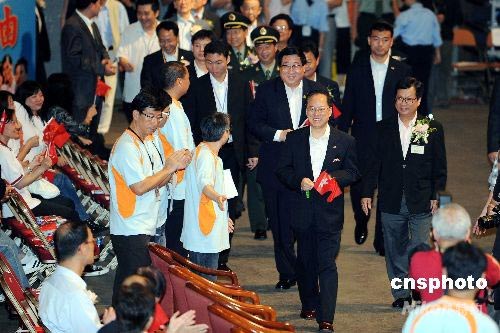 七月一日,香港回歸祖國十一周年紀念日,香港各界慶典委員會在香港體育館舉行盛大綜合文藝匯演,表達對汶川大地震災后重建、慶祝香港回歸及北京奧運的支持。特區(qū)行政長官曾蔭權(quán)、中聯(lián)辦主任高祀仁等嘉賓出席,并與現(xiàn)場數(shù)萬觀眾共同歡慶。中新社發(fā) 洪少葵 攝