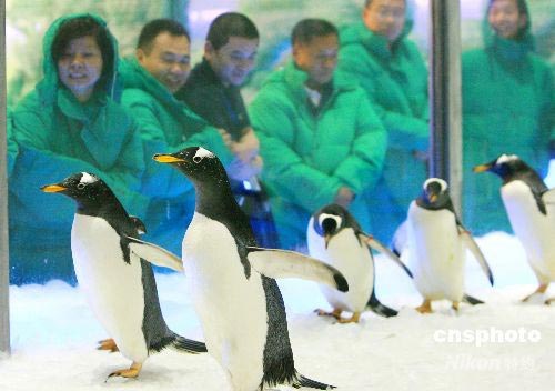 2008年7月3日凌晨,6只(3雌3雄)年齡分別為6至8歲的南極白眉企鵝從大連圣亞極地世界首次出遠(yuǎn)門,乘坐飛機抵達(dá)蘇州市高新區(qū)白馬澗生態(tài)園,應(yīng)邀參加以“極地科普、呼吁環(huán)保”為主題的“2008蘇州白馬澗冰雪狂歡飲料節(jié)”助游展演活動。該活動自7月5日起在該市舉行為期兩周。中新社發(fā) 蘇秀 攝
