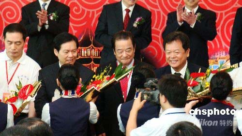 7月4日早晨七點(diǎn),兩岸周末包機(jī)南京首航暨大陸居民赴臺(tái)旅游首發(fā)儀式在南京祿口國(guó)際機(jī)場(chǎng)隆重舉行。圖為空乘人員向乘客代表等獻(xiàn)花。中新社發(fā) 丁梅 攝