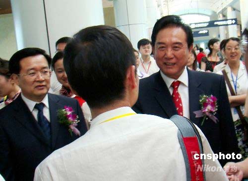 圖為海協(xié)會(huì)會(huì)長(zhǎng)陳云林歡送赴臺(tái)旅游的大陸居民。中新社發(fā) 丁梅 攝