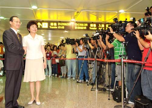 由海峽兩岸旅游交流協(xié)會(huì)會(huì)長(zhǎng)邵琪偉率領(lǐng)的大陸居民赴臺(tái)旅游(北京)首發(fā)團(tuán)4日中午12時(shí)20分許乘國(guó)航包機(jī)抵達(dá)臺(tái)北桃園機(jī)場(chǎng)。臺(tái)灣海峽兩岸觀光旅游協(xié)會(huì)(臺(tái)旅會(huì))會(huì)長(zhǎng)賴瑟珍(右)到桃園機(jī)場(chǎng)迎接邵琪偉一行。(“中央社”圖)