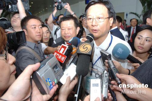 7月4日,臺(tái)灣彰化縣長(zhǎng)卓伯源先生搭乘華信航空的周末包機(jī)從臺(tái)中甫抵廈門,即在機(jī)場(chǎng)接受蜂擁而至的記者集體采訪。中新社發(fā) 鄭祚聲 攝