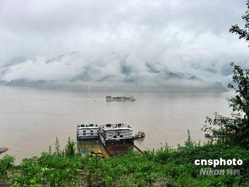 2008年7月5日,三峽大壩上游近壩區(qū)湖北秭歸大雨滂沱,雨后水黃山翠云蒸霧繞,群峰連綿起伏時(shí)隱時(shí)現(xiàn),恰似天上“仙境”落人間。據(jù)當(dāng)?shù)鼐用窠榻B,這是三峽成庫后,首次出現(xiàn)引人入勝的夏霧美景。中新社發(fā) 韓玉洪 攝