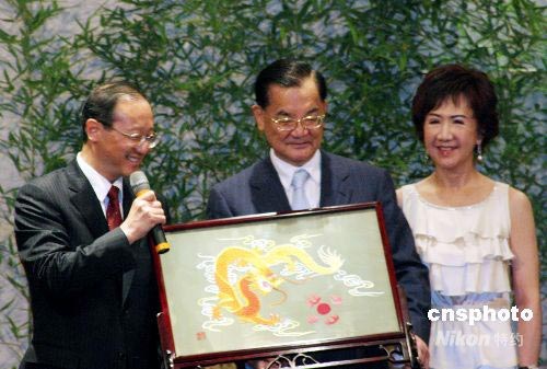 7月5日,中國國民黨榮譽主席連戰(zhàn)夫婦及部分國民黨高層在臺北會見到訪的海峽兩岸旅游交流協(xié)會會長邵琪偉一行。連戰(zhàn)表示,大陸居民赴臺旅游和兩岸周末包機的實現(xiàn),不僅為兩岸關(guān)系和平發(fā)展的偉大目標作出了貢獻,更為中華民族興盛發(fā)展寫下了新的一頁。會見之后,連戰(zhàn)和邵琪偉互贈禮物。禮物皆與“龍”有關(guān)。連戰(zhàn)贈給邵琪偉的禮物是由臺灣新竹工藝大師制作的琉璃“吉祥云龍”,“象征兩岸同屬中華民族,都是炎黃子孫,期待將來有更多的客運、貨運包機飛翔在兩岸的天空中”。邵琪偉贈送給連戰(zhàn)的是湘繡龍紋雙面繡。中新社發(fā) 黃少華 攝