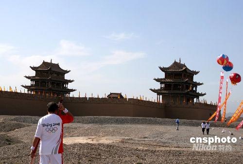 第203棒火炬手楊壯(左)和第204棒火炬手、甘肅省副省長(zhǎng)郝遠(yuǎn)在“天下第一雄關(guān)”的城樓上交接火炬。 中新社發(fā) 周兆軍 攝