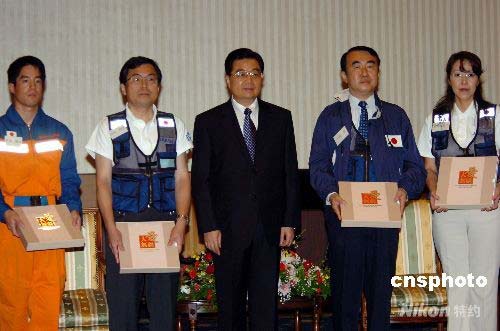 胡錦濤在札幌向日本國際救援隊(duì)醫(yī)療隊(duì)贈送禮品