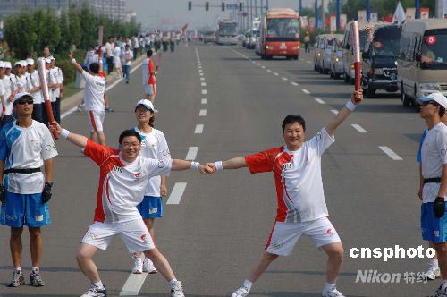 7月8日,奧運(yùn)火炬在呼和浩特傳遞。圖為第19棒火炬手劉洪和第18棒火炬手吉日木圖正在交接火炬。中新社發(fā) 廖攀 攝