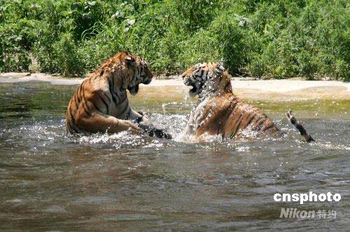 東北虎林園,兩只東北虎在水中嬉戲。中新社發(fā) 周兆軍 攝
