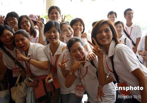 7月11日,臺(tái)灣學(xué)生在上海興高采烈地迎接夏令營(yíng)開營(yíng)。當(dāng)日,“龍脈相傳緣聚上!_(tái)胞青年夏令營(yíng)”在上海開營(yíng),來(lái)自臺(tái)灣政治大學(xué)、成功大學(xué)、海洋大學(xué)、佛光人文學(xué)院的同學(xué),以及在滬的臺(tái)生、臺(tái)籍青年等百余人參加。中新社發(fā) 潘索菲 攝