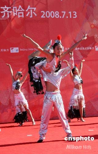 7月13日,北京奧運火炬在“丹頂鶴之鄉(xiāng)”齊齊哈爾傳遞,當(dāng)?shù)匮輪T擺出仙鶴造型,以獨特風(fēng)情喜迎圣火。 中新社發(fā) 周兆軍 攝