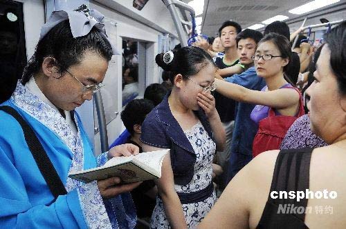 7月13日下午,一男子衣著漢服驚現(xiàn)北京地鐵2號線,其扮像引來不少乘客目光。