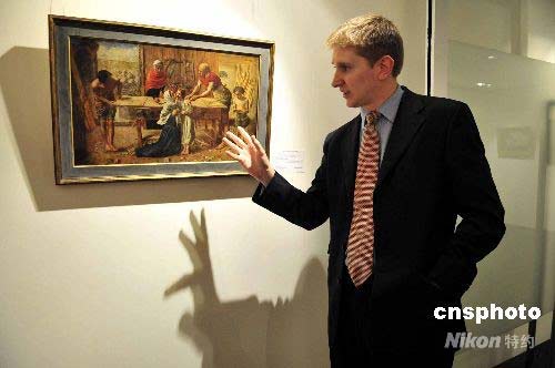 圖為《基督在家中》(作者:萊百克所羅曼及約翰米萊)估價(jià)約六百萬至九百萬港元。畫中主人翁為耶穌基督,他手掌因工受傷,血滴于腳背,圣母隨即上前安撫。中新社發(fā) 譚達(dá)明 攝