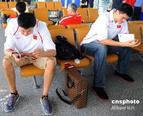 在北京機場候機時,中國男籃的“擎天拄”姚明與王郅治看書消磨時光。中新社發(fā) 任晨鳴 攝