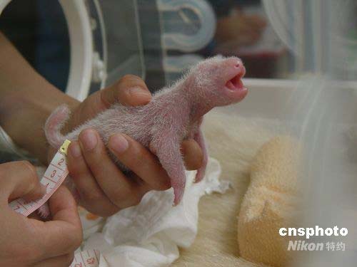 中國保護大熊貓研究中心雅安碧峰峽基地工作人員給熊貓幼仔量身長。中新社發(fā) 羅小韻 攝