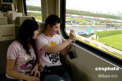 圖為一對情侶在機場專線上用相機拍攝沿途美景。