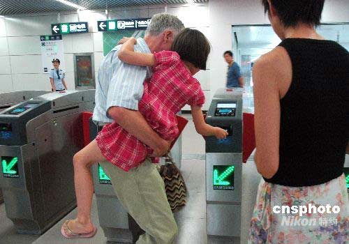 圖為在機(jī)場(chǎng)線(xiàn)三元橋車(chē)站入口處,外國(guó)游客一家人正在投票進(jìn)站。中新社發(fā) 張雙雙 攝
