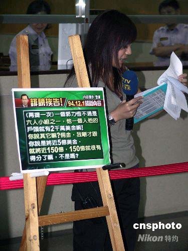 7月21日上午,臺北地方法院開庭審理臺灣前海軍軍官雷學明控告臺灣地區(qū)前領導人陳水扁等人誹謗案。這是陳水扁卸任后首度至法院出庭,臺灣媒體對此高度關注。圖為在臺北地院內,媒體制作看板,女記者在現場報道案情審理進展。中新社發(fā) 徐長安 攝