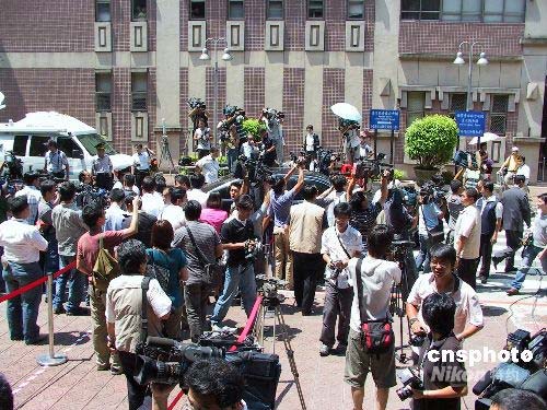 七月二十一日,臺(tái)北地方法院開庭審理臺(tái)灣海軍前軍官雷學(xué)明控告陳水扁等人誹謗案。這是陳水扁卸任臺(tái)灣地區(qū)領(lǐng)導(dǎo)人后首度至法院出庭,臺(tái)灣媒體對(duì)此高度關(guān)注。圖為庭審結(jié)束后,陳水扁離開時(shí),媒體仍鍥而不舍圍堵其坐車。中新社發(fā) 徐長(zhǎng)安 攝