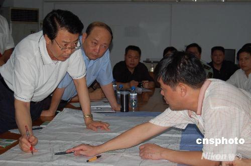 國家安監(jiān)總局局長王君(左一)連夜趕赴廣西百色,并于7月22日凌晨抵達百色煤礦透水事故現(xiàn)場,部署營救工作。中新社發(fā) 劉萬強 攝