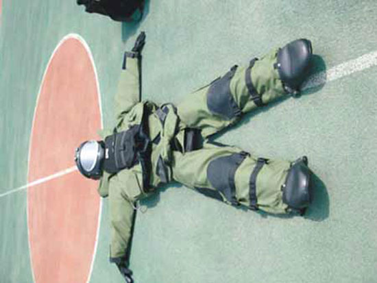 排爆服能夠防護爆炸后產(chǎn)生的超壓、碎片、沖擊波,對排爆專家進行全方位的保護。其頭盔里,裝有智能型電池驅(qū)動電源系統(tǒng)和排風(fēng)系統(tǒng),還有智能式聲音放大器及巨響防護裝置。排爆服“躺”在地上,就像一個人。它是目前世界上最先進的防爆服,歷經(jīng)5年時間在全新平臺上研制出來,具備最新的模塊化防護組合,提供更高的防護能力。它的配置更加齊全,腕部配有頭盔遙控器,調(diào)節(jié)和控制更加方便。頭盔面罩可以掀起,頭盔上方配備高亮度發(fā)光二極管照明燈,操作更加方便。一米范圍內(nèi),500克炸藥爆炸不會危及排爆者的生命。