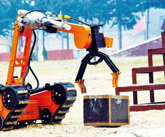 排爆機(jī)器人是“秘密武器”中的明星,“身價(jià)”不菲。它可用于在種復(fù)雜地形進(jìn)行排爆。具有出眾的爬坡、爬樓能力,能靈活抓起多種形狀、各種擺放位置和姿勢(shì)的嫌疑物品。最大爬坡能力為45度樓梯。可遠(yuǎn)距離連續(xù)銷(xiāo)毀爆炸物。還標(biāo)配可遙控轉(zhuǎn)動(dòng)彩色攝像機(jī),其中大變焦攝像機(jī)可128倍放大,確保觀(guān)察無(wú)死角。