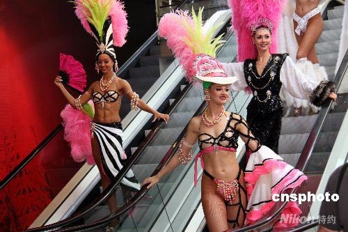 7月24日下午,法國巴黎著名的麗都夜總會的舞娘在巴黎老佛爺百貨男裝館,為游人和顧客獻(xiàn)上風(fēng)情萬種的火辣演出,為巴黎老佛爺百貨公司在今夏七月推出的特別促銷活動助陣。中新社發(fā) 王倩 攝