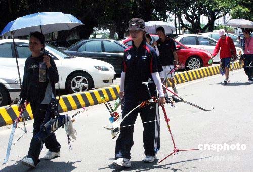 圖為中午,射箭運(yùn)動員們正結(jié)束訓(xùn)練,返回休息。中新社發(fā) 黃少華 攝