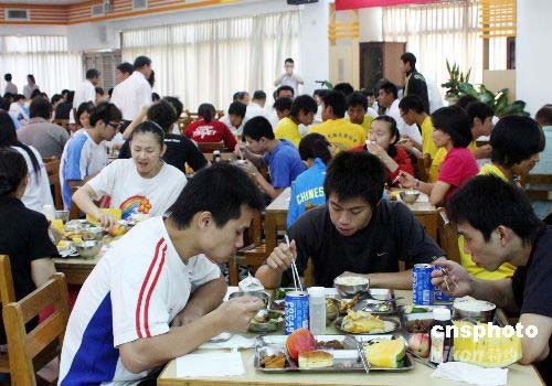 圖為運(yùn)動(dòng)員餐廳內(nèi),選手們正享美食,有燉牛肉、蒸雞蛋、炒時(shí)蔬,還有各樣水果,中西餐兼?zhèn),葷素搭配,花樣齊全。中新社發(fā) 黃少華 攝