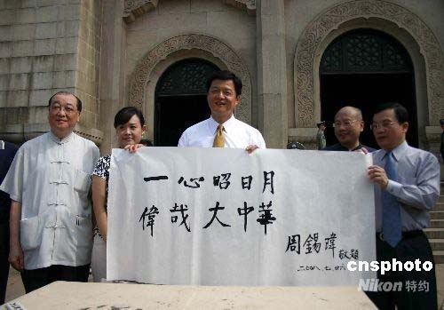 七月二十六日,臺北縣長周錫瑋率臺北縣南京參訪團(tuán)一行十人拜謁南京中山陵,題字“一心昭日月,偉哉大中華”。周錫瑋一行二十五日晚間乘坐南京首航后的第四班兩岸周末包機(jī)抵達(dá)南京祿口國際機(jī)場,開始為期五天的訪問行程。中新社發(fā) 朱曉穎 攝