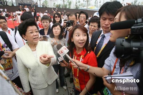 7月27日,北京奧運(yùn)會(huì)的運(yùn)動(dòng)員之家——奧運(yùn)村正式開村,來自205個(gè)國家和地區(qū)的16000名運(yùn)動(dòng)員和隨隊(duì)官員將逐步入住。圖為奧運(yùn)村村長陳至立接受香港媒體采訪。中新社發(fā) 武仲林 攝