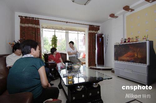 7月28日,奧運(yùn)村“前村民”李美鳳一家正在自家寬敞的房子里觀看奧運(yùn)村開(kāi)村的相關(guān)新聞。北京奧運(yùn)會(huì)場(chǎng)館建設(shè)中共有六千余戶家庭、近一萬(wàn)五千人被拆遷安置,其中百分之八十的拆遷戶與李美鳳一樣,搬到了奧林匹克綠地內(nèi),其他的拆遷戶則被安置在新建奧運(yùn)場(chǎng)館的周?chē)?中新社發(fā) 王東明 攝
