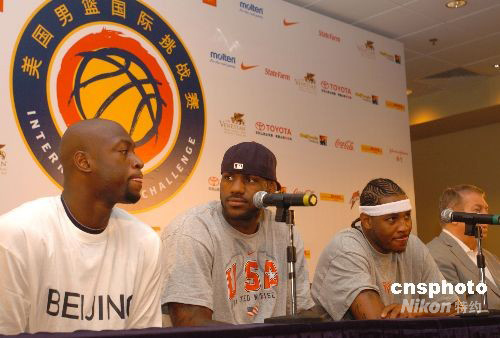 圖為七月二十八日抵達(dá)澳門的美國球員德懷恩·韋德(左一)、勒布朗·詹姆斯(左二)及卡梅隆·安東尼出席記者會(huì)。美國國家男籃隊(duì)將于七月三十一日及八月一日在澳門與土耳其及立陶宛隊(duì)進(jìn)行兩場奧運(yùn)熱身賽。中新社發(fā) 畢永光 攝