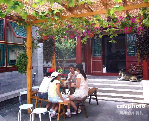 圖為首戶獲得“奧運(yùn)人家”青花瓷盤標(biāo)志的家庭——北京什剎海南官房胡同39號(hào)。 這座典型的北京民居,雕梁畫棟,整潔清新,院中的石榴樹和牡丹花透著勃勃生機(jī),蟈蟈在竹籠里歡快地叫著。游客們圍坐在石桌前聆聽主人敘述這座四合院的來歷:“四合院由東、南、西、北四面的房間圍合而成,里面是一個(gè)中心庭院,已有兩千多年的歷史。古代,正房中間的椅子是專門給長輩坐的,因?yàn)楦改甘羌依镒钍茏鹁吹娜。父親坐在左邊,母親坐在右邊!奔彝ブv解員們不停地向前來參觀的國內(nèi)外游客講述這座院落的歷史。 據(jù)介紹,自從被評(píng)為首個(gè)“奧運(yùn)人家”以后,國內(nèi)外各地的游客紛至沓來,前來參觀的游客人數(shù)驟增,于是親戚們便自發(fā)來幫忙,目前家里的工作人員有十幾人,其中有三個(gè)人的英語都是六級(jí),奧運(yùn)會(huì)期間,這三個(gè)人將會(huì)請(qǐng)假專職在四合院為來訪的奧運(yùn)賓客服務(wù)!