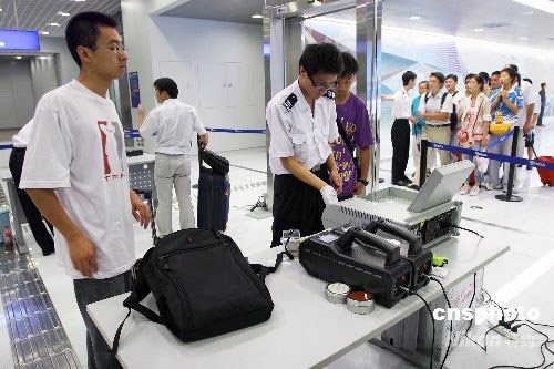 7月29日,乘坐新開行的機場輕軌的旅客在進入首都機場航站樓時,排隊接受嚴格的安保檢查。當日距北京奧運開幕還有10天,北京警方加強安保工作。 中新社發(fā) 劉新 攝