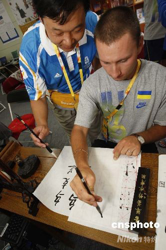 各國(guó)運(yùn)動(dòng)員和隨隊(duì)工作人員已陸續(xù)抵達(dá)奧運(yùn)村,他們?cè)趭W運(yùn)村住宅區(qū)和國(guó)際區(qū)商業(yè)文化街游玩購(gòu)物,感受濃郁的奧運(yùn)氣息和古老的中國(guó)文化。圖為7月29日,來自烏克蘭的射箭運(yùn)動(dòng)員亞歷山大,在北京奧運(yùn)村服務(wù)人員輔導(dǎo)下學(xué)寫中文毛筆字。 中新社發(fā) 杜洋 攝