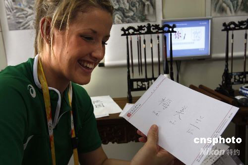 7月29日,來(lái)自愛(ài)爾蘭的女選手在北京奧運(yùn)村中文服務(wù)中心,請(qǐng)人幫助自己起了一個(gè)好聽(tīng)的中文名字“梅美蘭”非常開(kāi)心。 中新社發(fā) 杜洋 攝