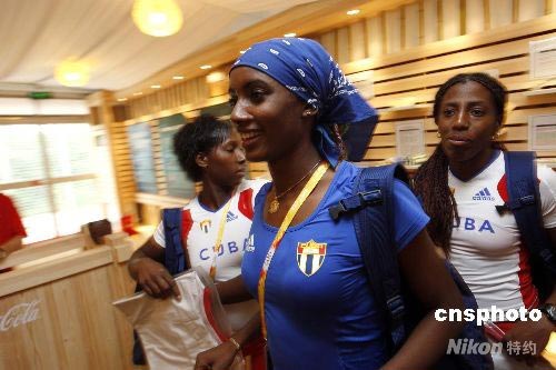 7月29日,來自古巴的女運(yùn)動員在北京奧運(yùn)村的紀(jì)念章交換中心參觀。中新社發(fā) 杜洋 攝