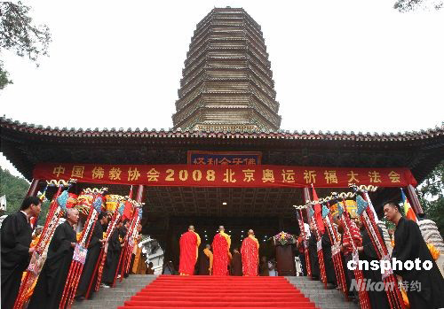 8月1日,中國佛教協(xié)會2008北京奧運祈福大法會在北京八大處靈光寺舉行,包括僧人、居士、百姓等近千人參加。中新社發(fā) 張宇 攝