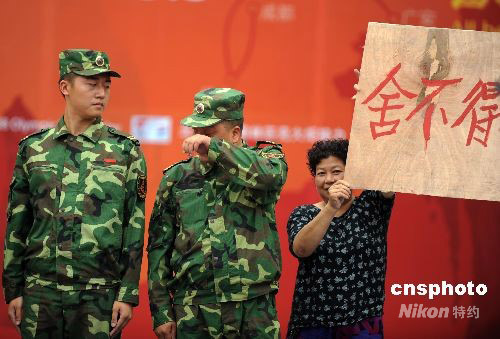 8月5日,奧運火炬在四川成都傳遞,在傳遞結(jié)束儀式上四川民眾為抗震官兵舉起“舍不得你們走”的標語,抗震官兵感動抹淚。 中新社發(fā) 廖攀 攝