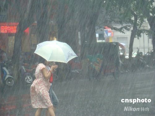 8月6日中午,?谑軣釒эL暴“北冕”影響,不時下起瓢潑大雨。據海南省氣象臺預報,當日白天到夜間,海南島除西部外均將有大到暴雨。圖為行人艱難地在雨中行走。中新社發(fā) 付美斌 攝