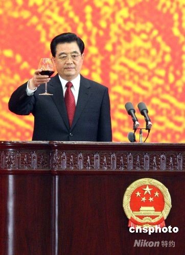 8月8日,中國國家主席胡錦濤在北京人民大會(huì)堂宴會(huì)廳為出席北京奧運(yùn)會(huì)的貴賓舉行歡迎宴會(huì)。圖為胡錦濤在歡迎宴會(huì)上祝酒。中新社發(fā) 廖文靜 攝