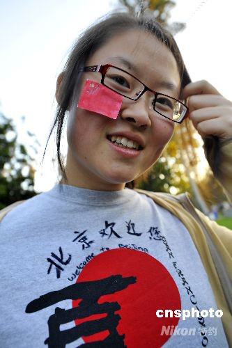 圖為剛到美國(guó)2年的高一女生自己制作了國(guó)旗貼紙和“北京歡迎你”字樣的T恤衫觀看北京奧運(yùn)開(kāi)幕式轉(zhuǎn)播。中新社發(fā) 陳鋼 攝